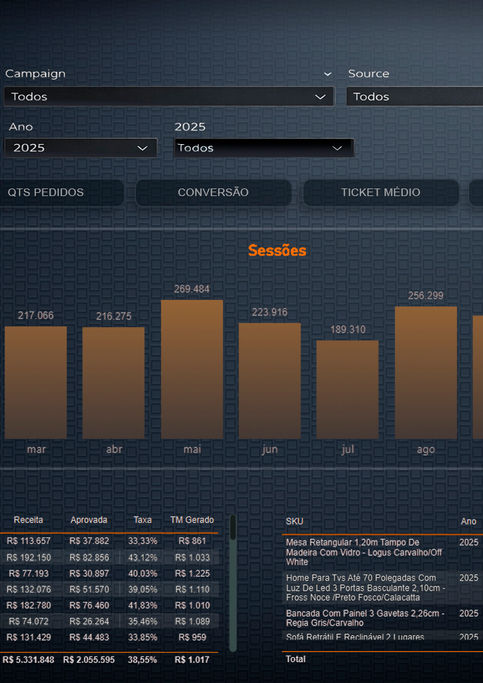 Unifica indicadores de vendas, marketing e desempenho de produtos em dashboard intuitivo e organizado.